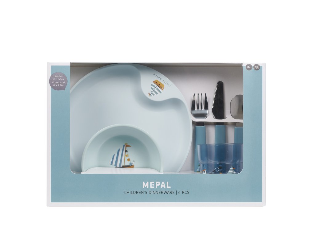 Bledo modrý detský 6 dielny set Mepal Mio v motíve Sailors Bay. Darčekovo zabalený set obsahuje 3 kusy príboru, veľký tanier, misku a pohárik na pitie.